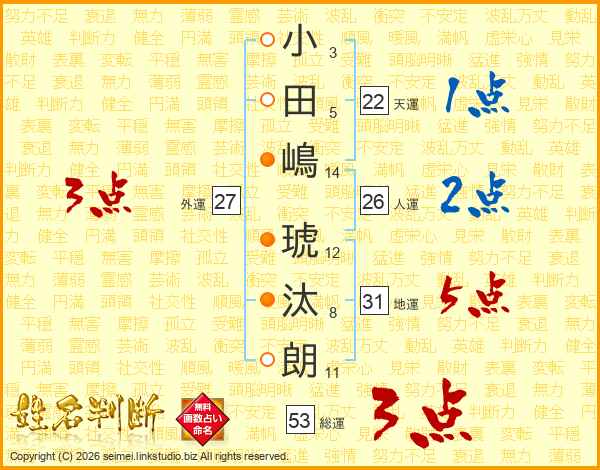 小田嶋琥汰朗さんの総運は53画の3点!