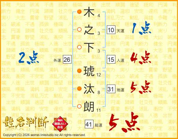 木(4画)之(3画)下(3画) 琥(12画)汰(8画)朗(11画)