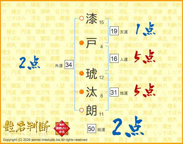 漆戸琥汰朗さんの地運は31画の5点!