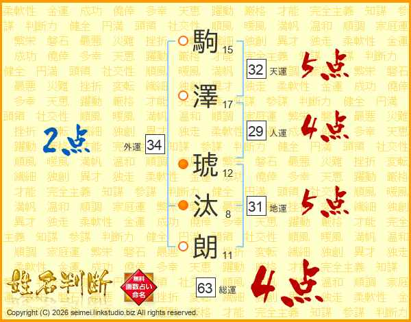 駒澤琥汰朗さんの総運は63画の4点!