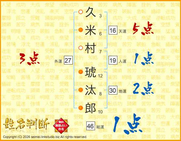 久(3画)米(6画)村(7画) 琥(12画)汰(8画)郎(10画)