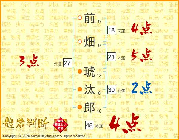 前(9画)畑(9画) 琥(12画)汰(8画)郎(10画)