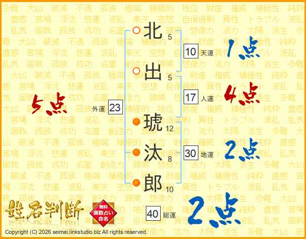 北(5画)出(5画) 琥(12画)汰(8画)郎(10画)