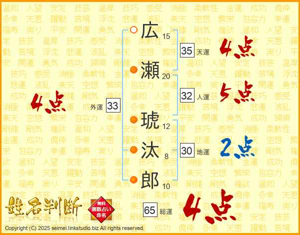 広(15画)瀬(20画) 琥(12画)汰(8画)郎(10画)