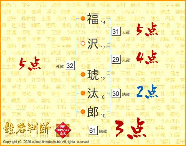 福(14画)沢(17画) 琥(12画)汰(8画)郎(10画)