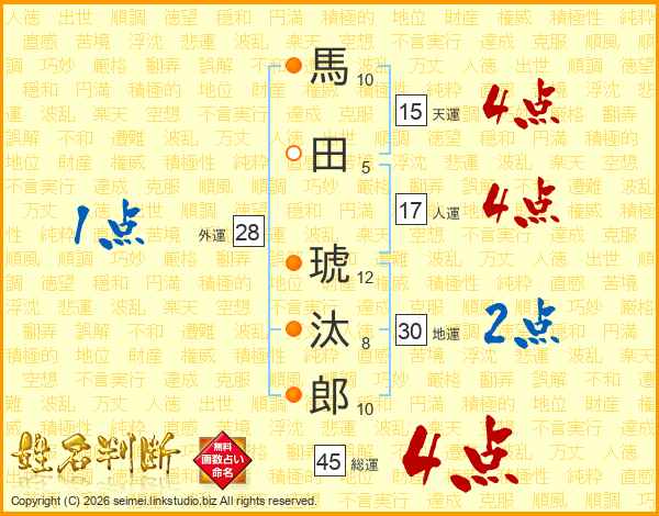 馬田琥汰郎さんの総運は45画の4点!