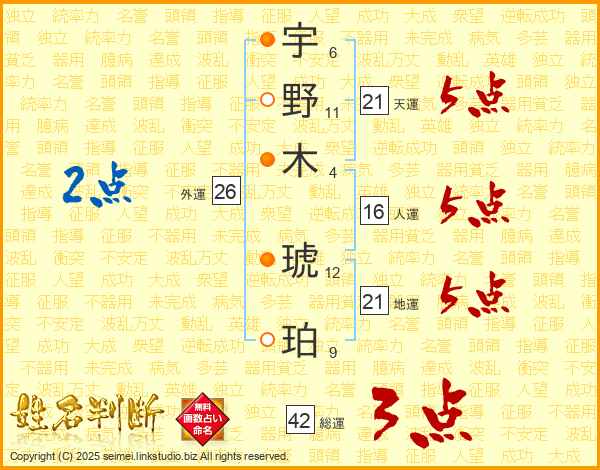宇(6画)野(11画)木(4画) 琥(12画)珀(9画)