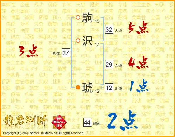 駒沢琥さんの総運は44画の2点!
