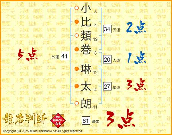 小(3画)比(4画)類(19画)巻(8画) 琳(12画)太(4画)朗(11画)