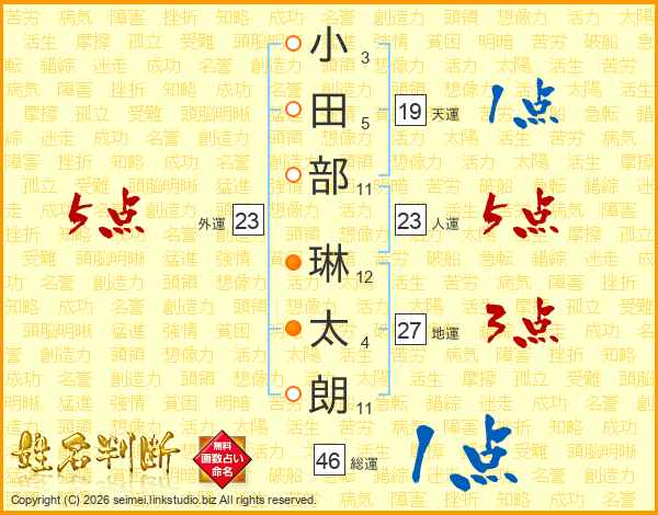 小(3画)田(5画)部(11画) 琳(12画)太(4画)朗(11画)