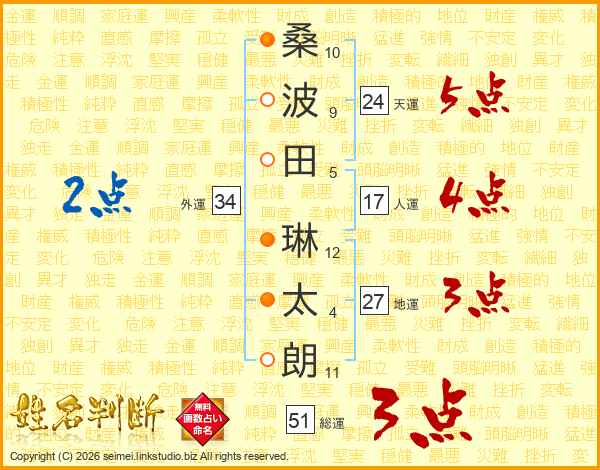桑(10画)波(9画)田(5画) 琳(12画)太(4画)朗(11画)