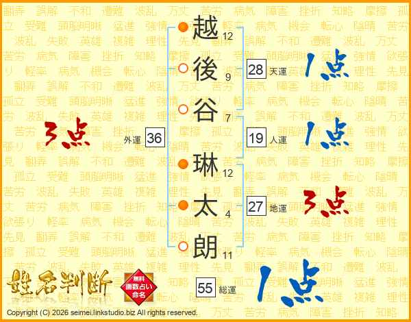 越(12画)後(9画)谷(7画) 琳(12画)太(4画)朗(11画)