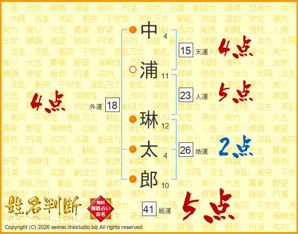 中(4画)浦(11画) 琳(12画)太(4画)郎(10画)