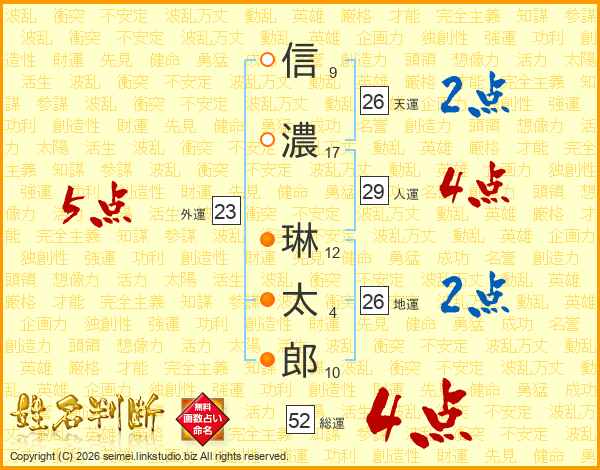 信(9画)濃(17画) 琳(12画)太(4画)郎(10画)