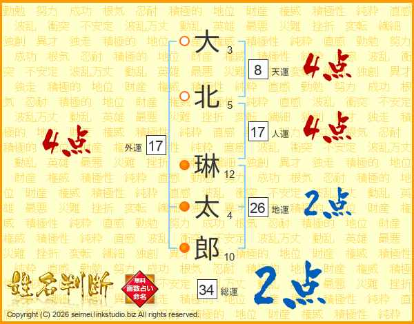 大(3画)北(5画) 琳(12画)太(4画)郎(10画)