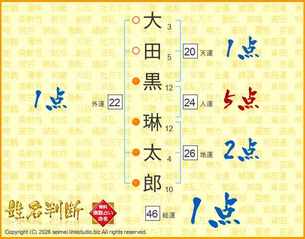 大(3画)田(5画)黒(12画) 琳(12画)太(4画)郎(10画)
