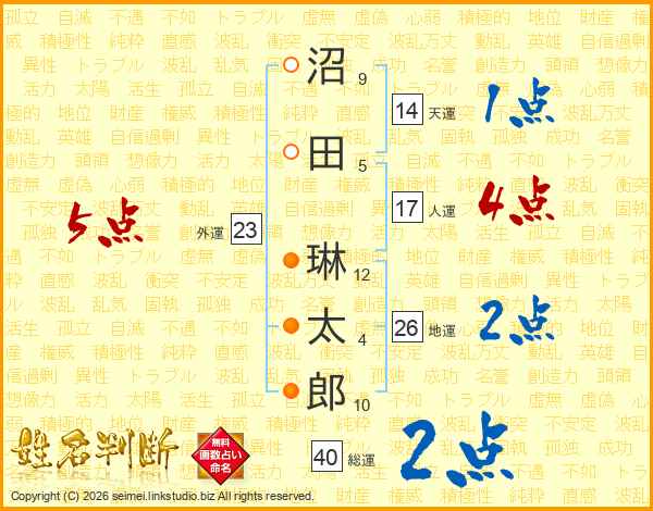 沼(9画)田(5画) 琳(12画)太(4画)郎(10画)