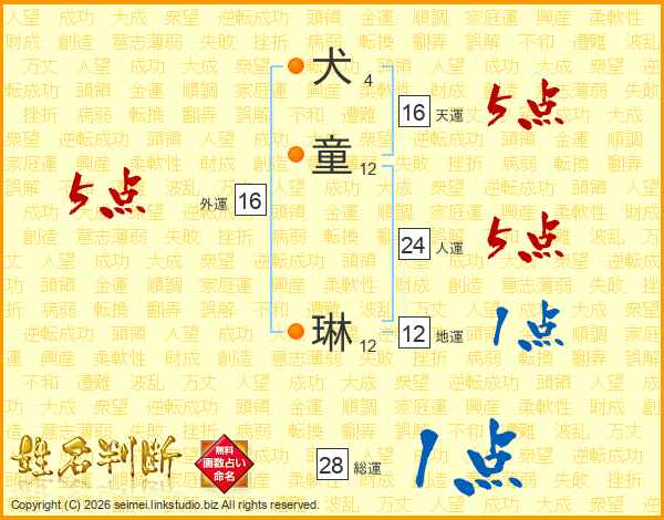 犬(4画)童(12画) 琳(12画)