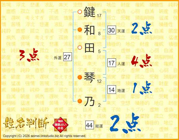 鍵(17画)和(8画)田(5画) 琴(12画)乃(2画)