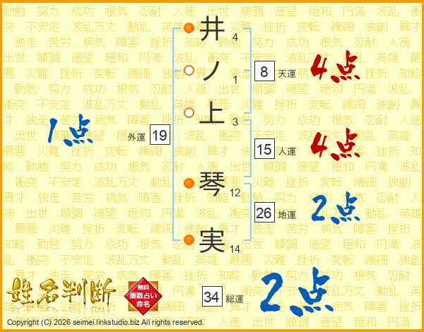 井(4画)ノ(1画)上(3画) 琴(12画)実(14画)