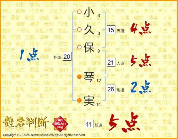 小(3画)久(3画)保(9画) 琴(12画)実(14画)