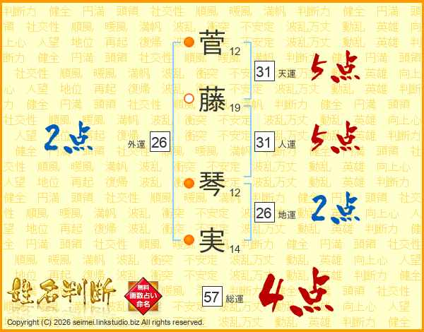 菅(12画)藤(19画) 琴(12画)実(14画)