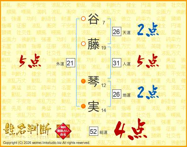 谷(7画)藤(19画) 琴(12画)実(14画)