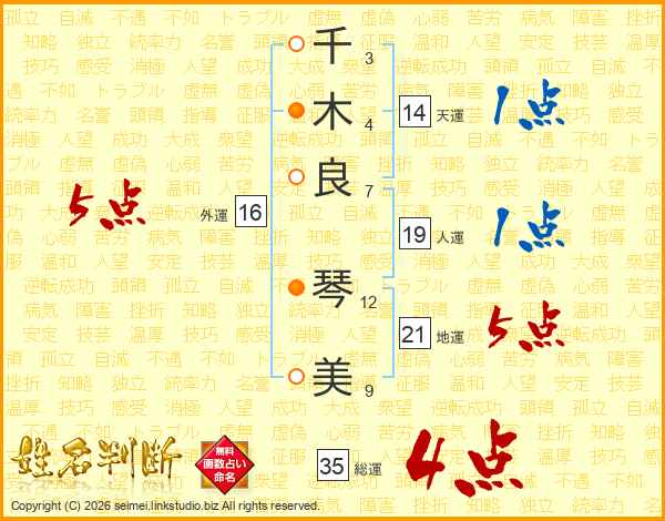 千(3画)木(4画)良(7画) 琴(12画)美(9画)