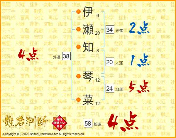 伊(6画)瀬(20画)知(8画) 琴(12画)菜(12画)