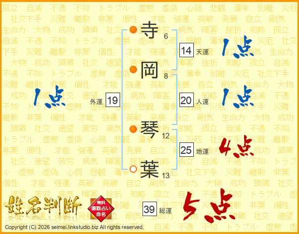 寺(6画)岡(8画) 琴(12画)葉(13画)