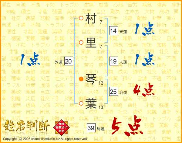 村里琴葉さんの総運は39画の5点!