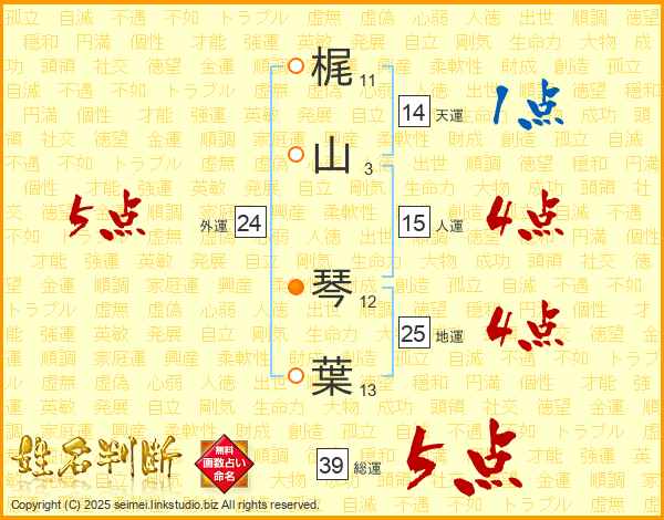 梶(11画)山(3画) 琴(12画)葉(13画)