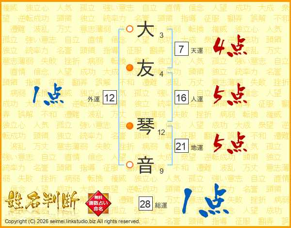 大(3画)友(4画) 琴(12画)音(9画)