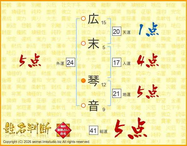 広(15画)末(5画) 琴(12画)音(9画)