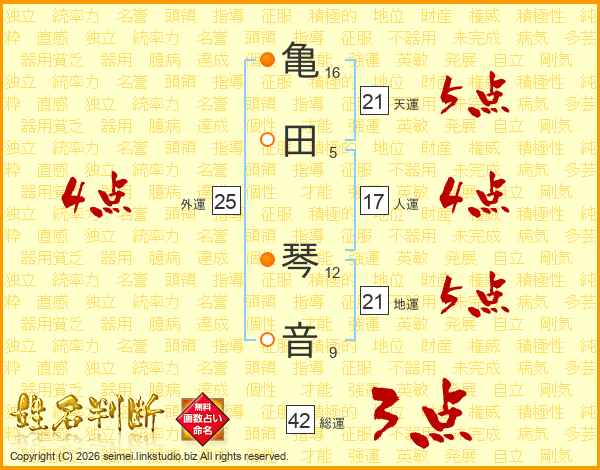 亀田琴音さんの天運は21画の5点!