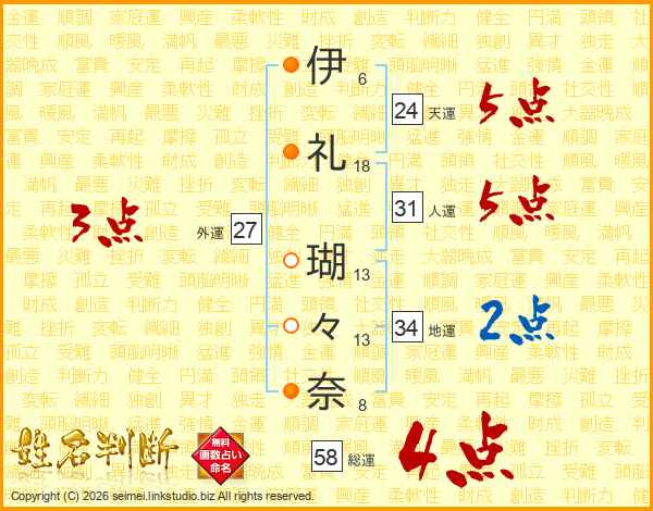 伊(6画)礼(18画) 瑚(13画)々(13画)奈(8画)