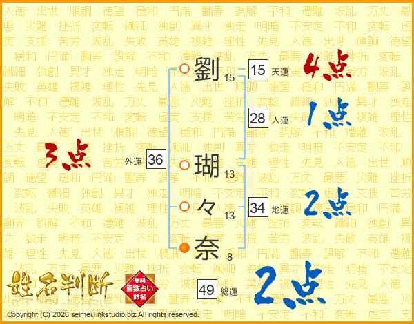 劉(15画) 瑚(13画)々(13画)奈(8画)