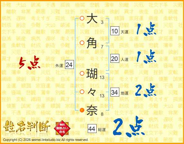 大(3画)角(7画) 瑚(13画)々(13画)奈(8画)