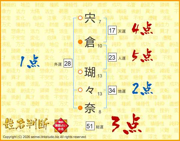 宍(7画)倉(10画) 瑚(13画)々(13画)奈(8画)