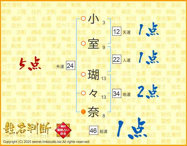 小(3画)室(9画) 瑚(13画)々(13画)奈(8画)