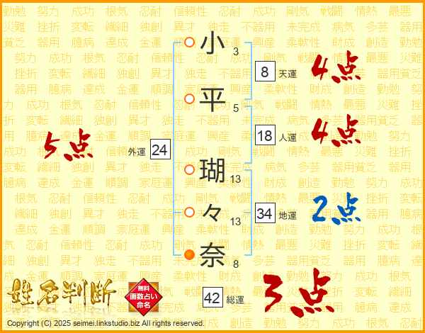 小(3画)平(5画) 瑚(13画)々(13画)奈(8画)
