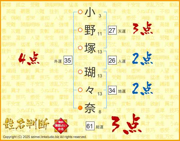 小(3画)野(11画)塚(13画) 瑚(13画)々(13画)奈(8画)