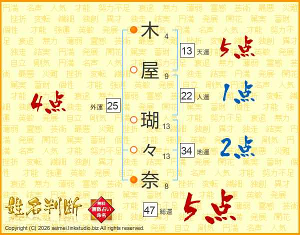 木屋瑚々奈さんの総運は47画の5点!