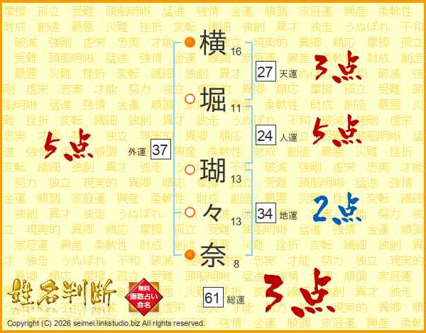 横(16画)堀(11画) 瑚(13画)々(13画)奈(8画)