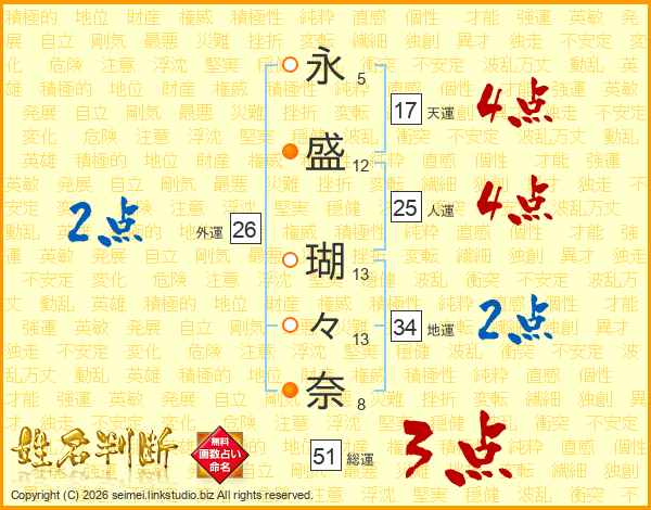永(5画)盛(12画) 瑚(13画)々(13画)奈(8画)