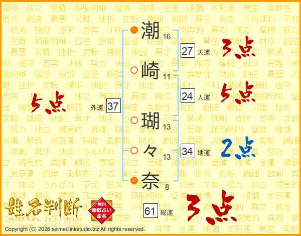 潮(16画)崎(11画) 瑚(13画)々(13画)奈(8画)