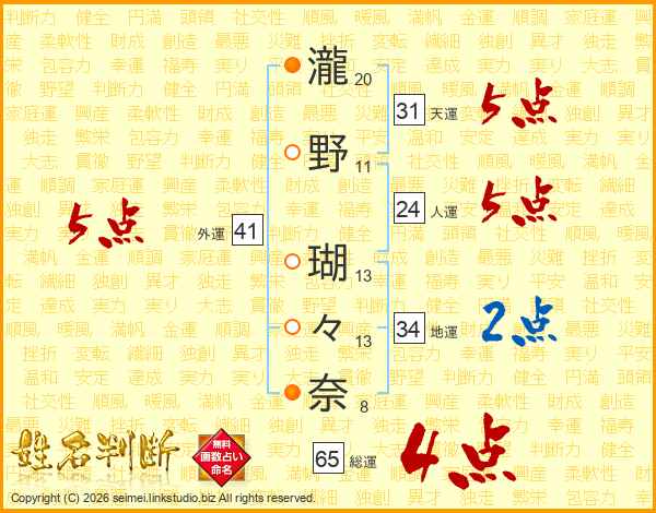 瀧野瑚々奈さんの総運は65画の4点!