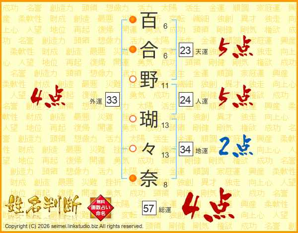 百(6画)合(6画)野(11画) 瑚(13画)々(13画)奈(8画)