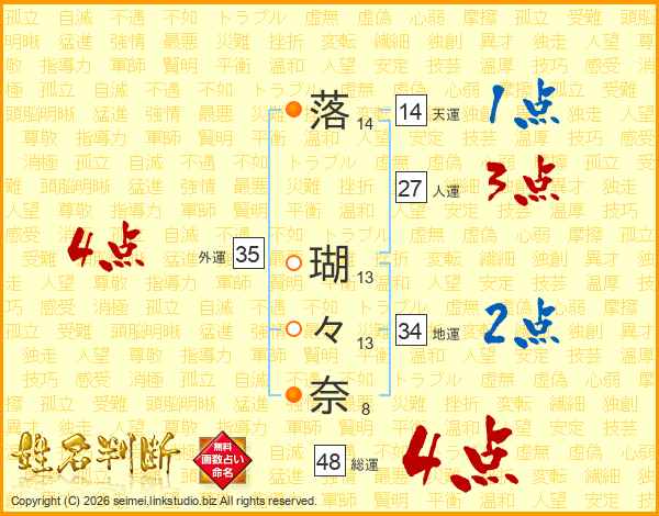 落(14画) 瑚(13画)々(13画)奈(8画)