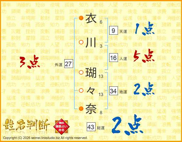 衣川瑚々奈さんの総運は43画の2点!
